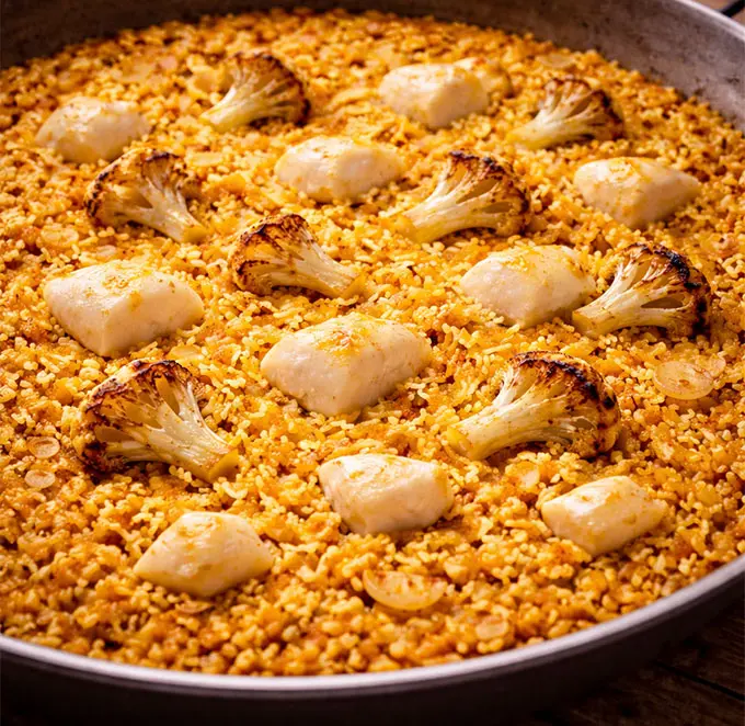 Arroz de coliflor y bacalao disponible en raciones o en paella.
