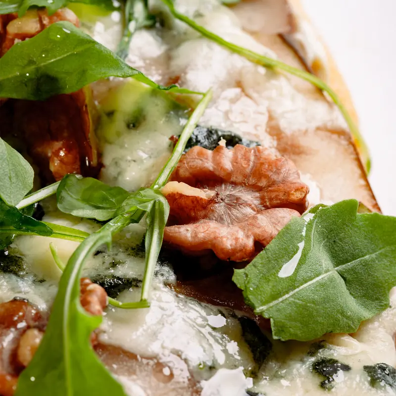 Coca salada gourmet hecha de masa amasada y horneada a mano selección de quesos, pera y nueces.