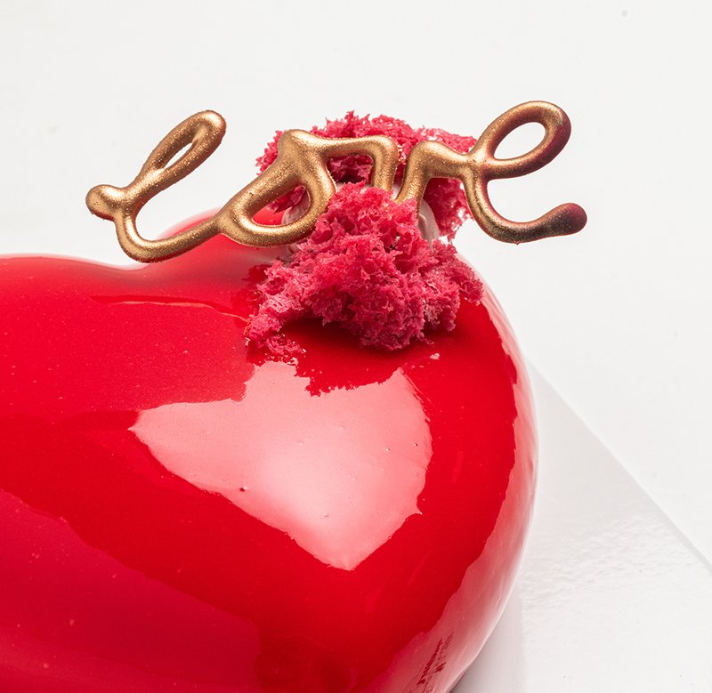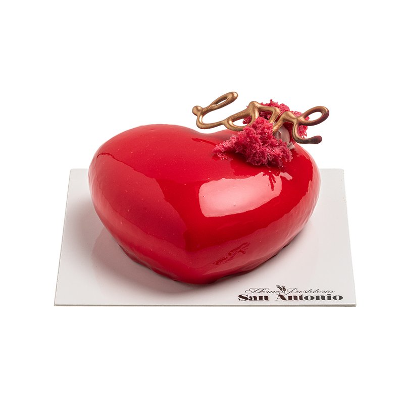 Tarta en forma de corazón con interior de chocolate blanco, fresas y frambuesas. Acabado con Baño de chocolate blanco y fresa.