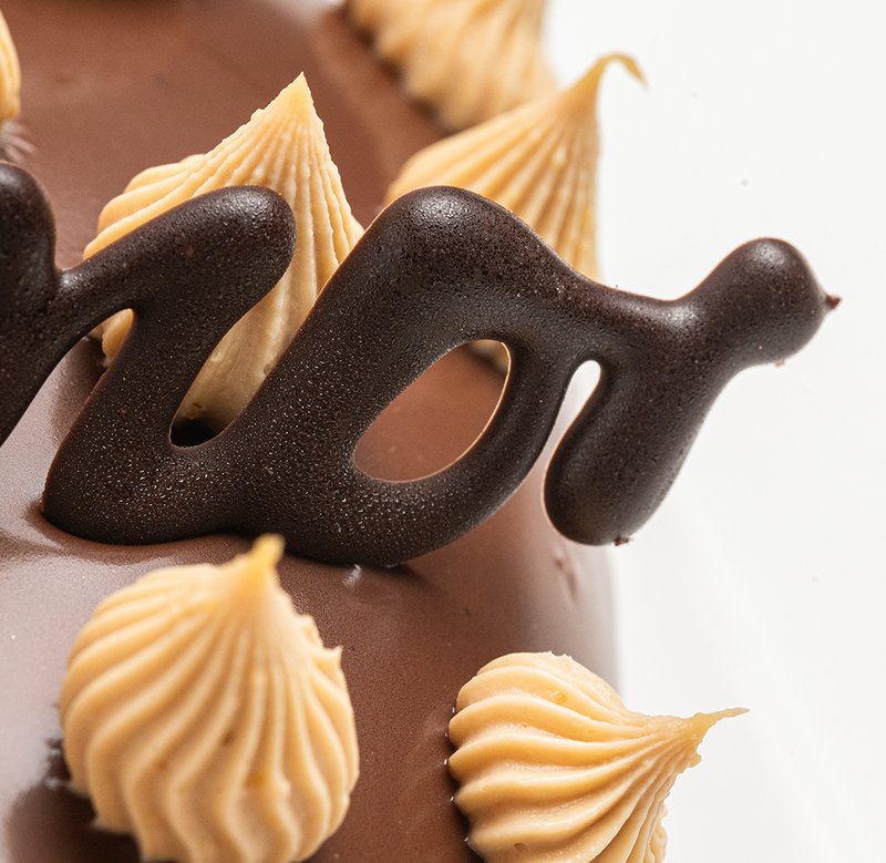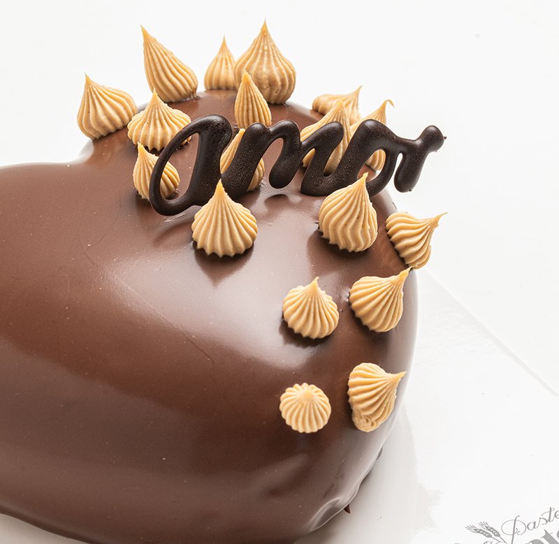 Tarta en forma de corazón con interior de ganache de chocolate en cinco texturas. Baño de chocolate brillante.