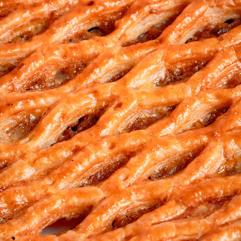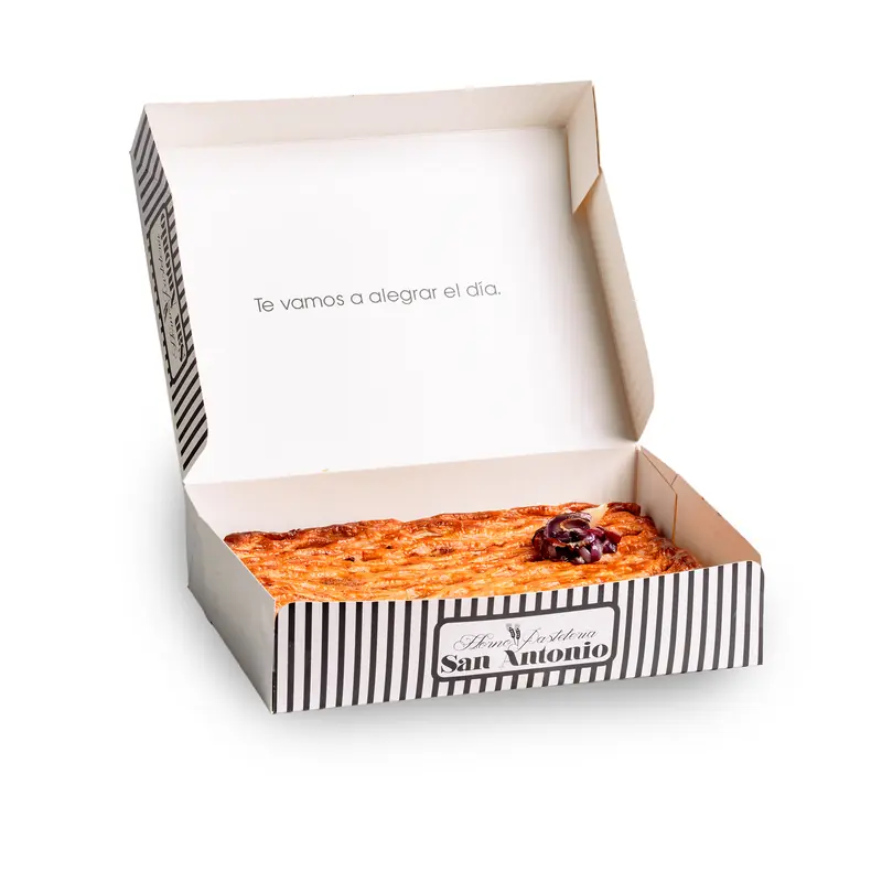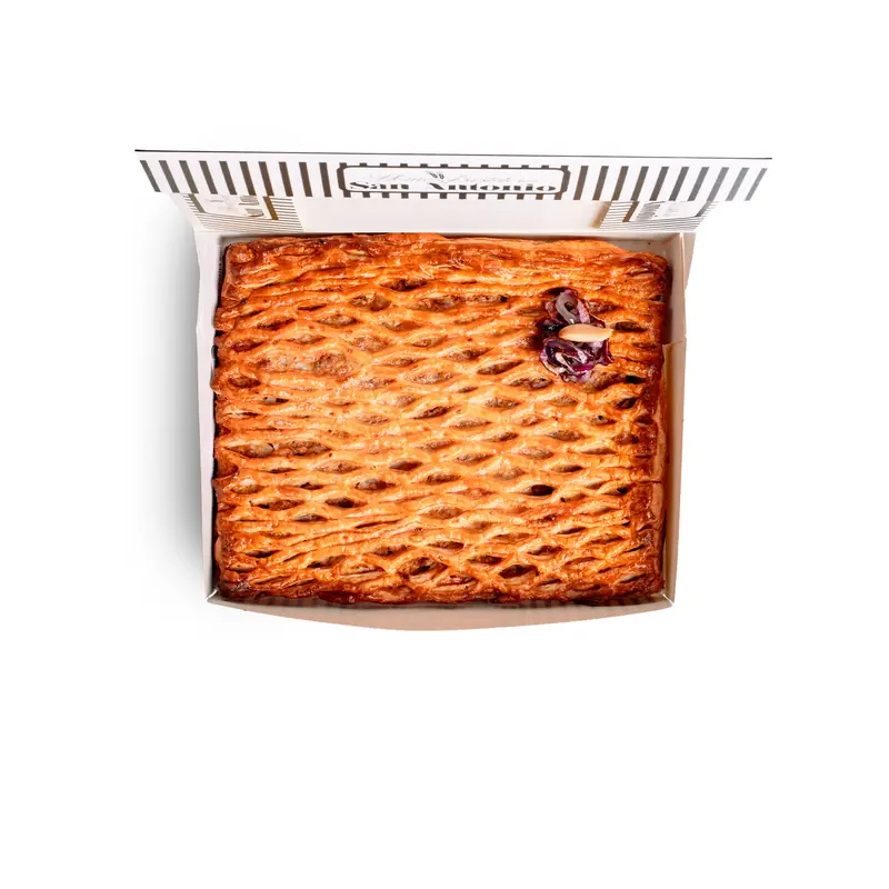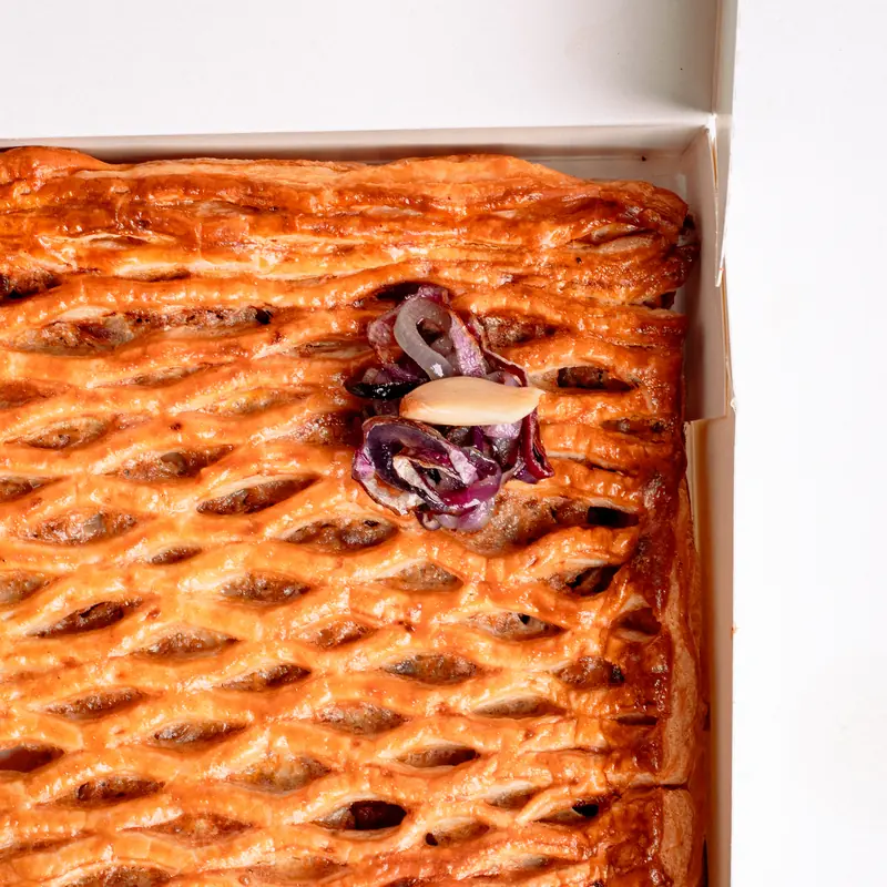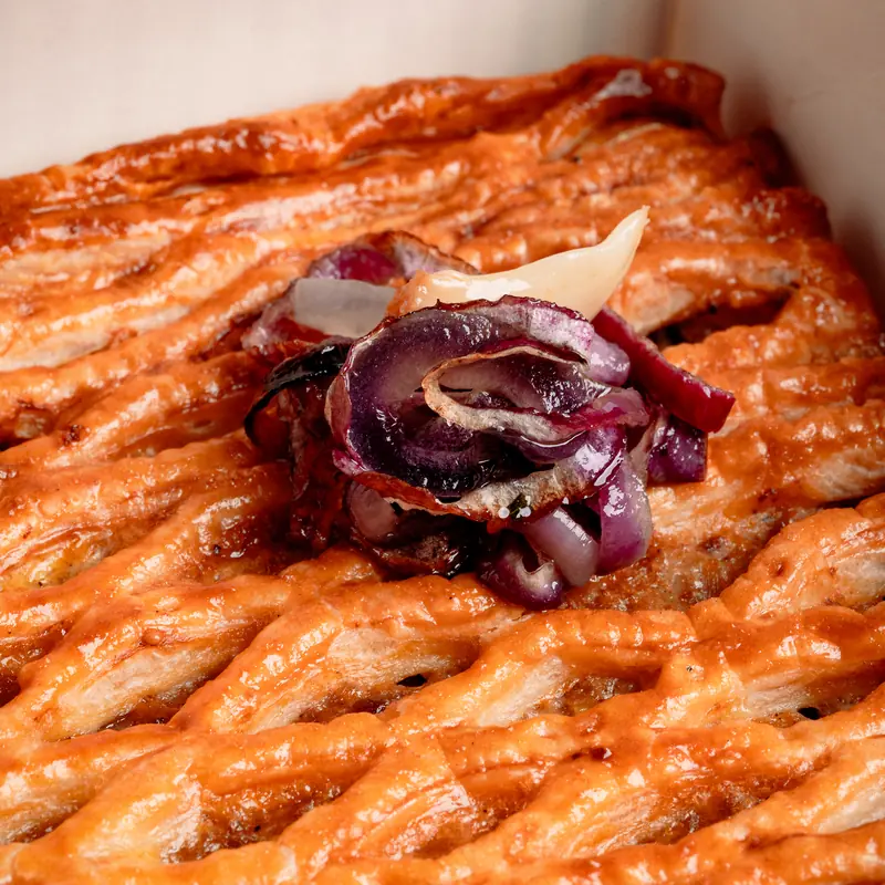 Empanada elaborada con una fina capa de hojaldre elaborada a mano y rellena de carne picada con cebolla.