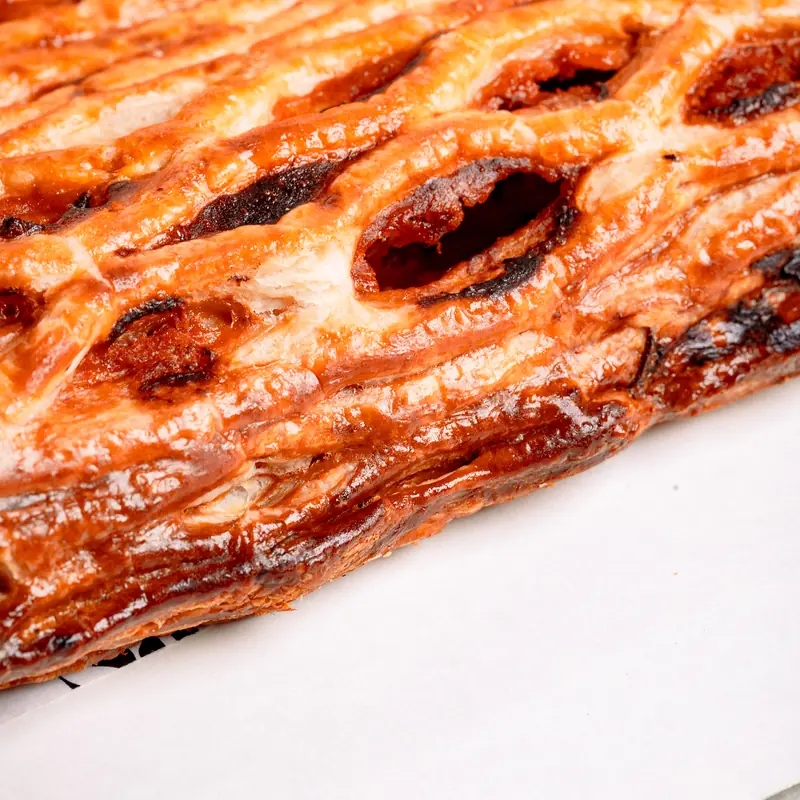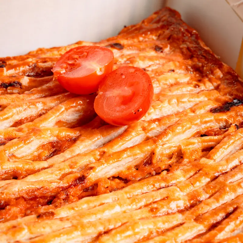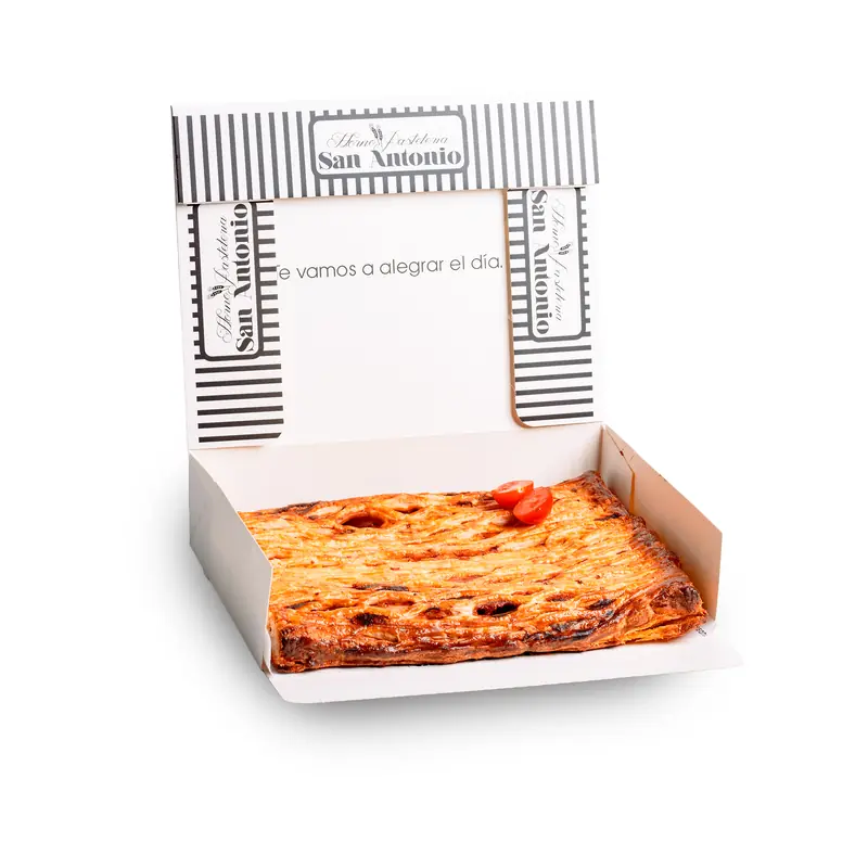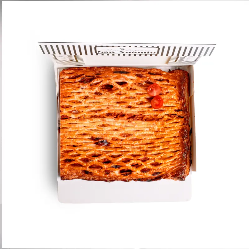 Empanada elaborada con una fina capa de hojaldre elaborada a mano y rellena de pisto valenciano.