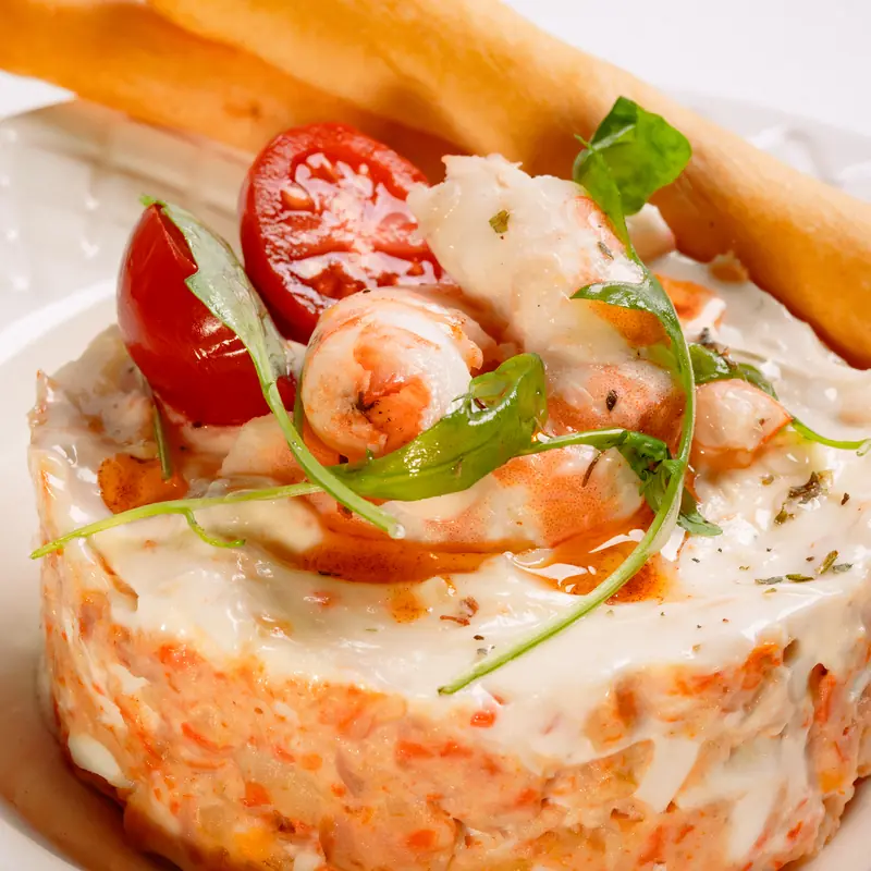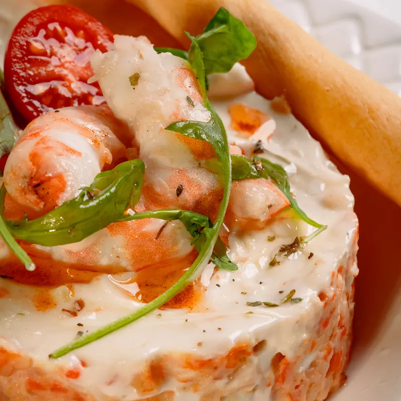 Ensalada casera de patata fría con mahonesa, verduras de temporada y langostinos cocidos.