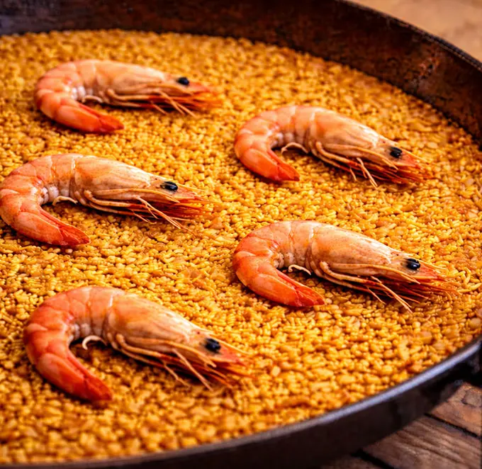 Paella de marisco disponible en raciones o en paella.