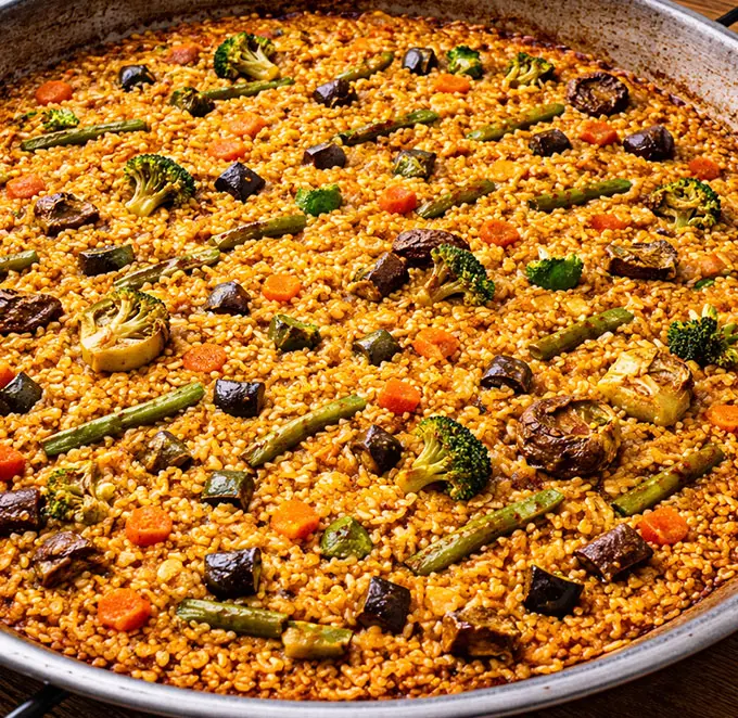 Paella de verduras disponible en raciones o en paella.