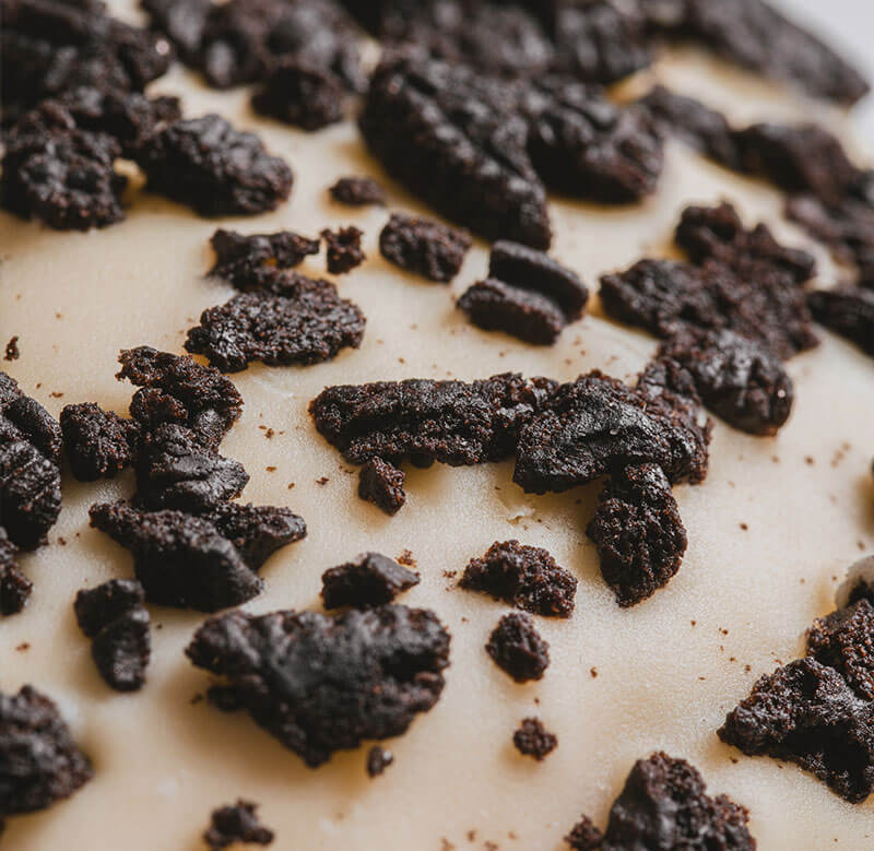 Panettone de Oreo con trocitos de galleta Oreo y relleno de chocolate blanco.