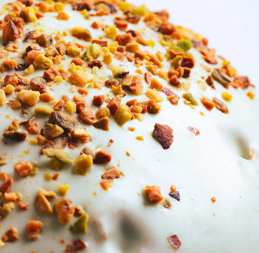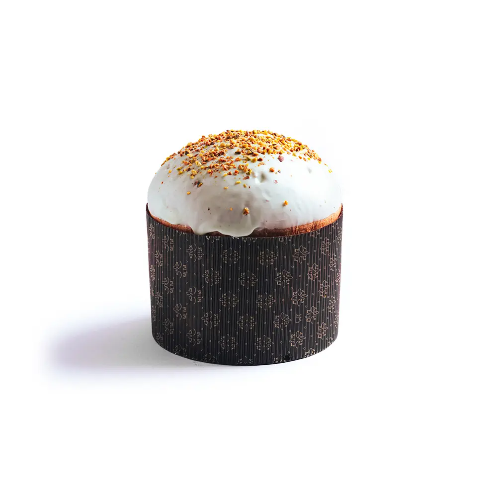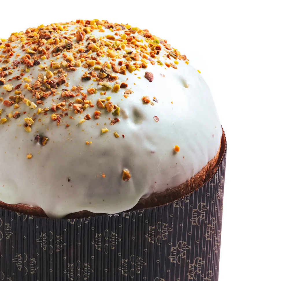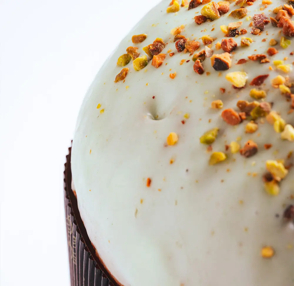 Panettone de Pistacho con pistachos y relleno de crema de pistacho.