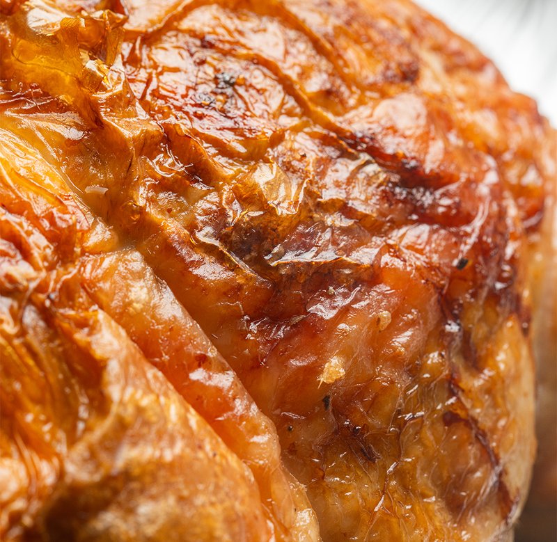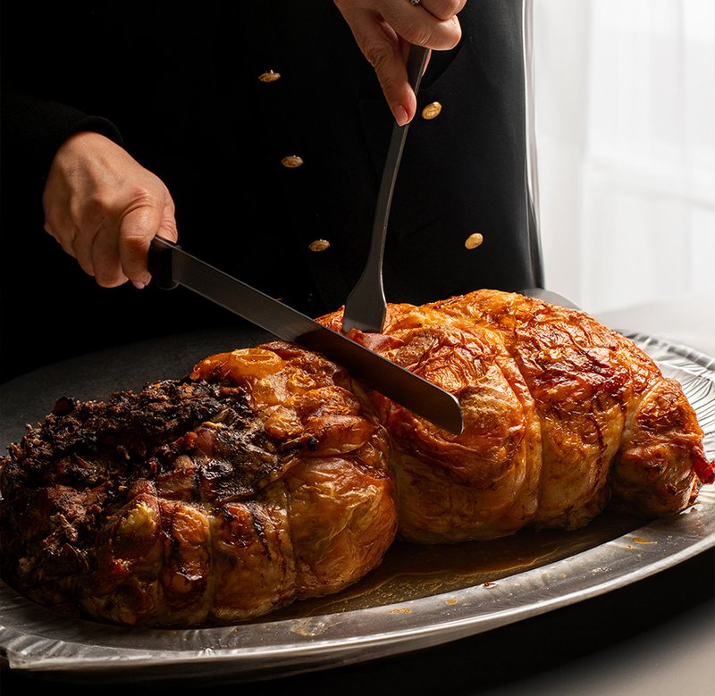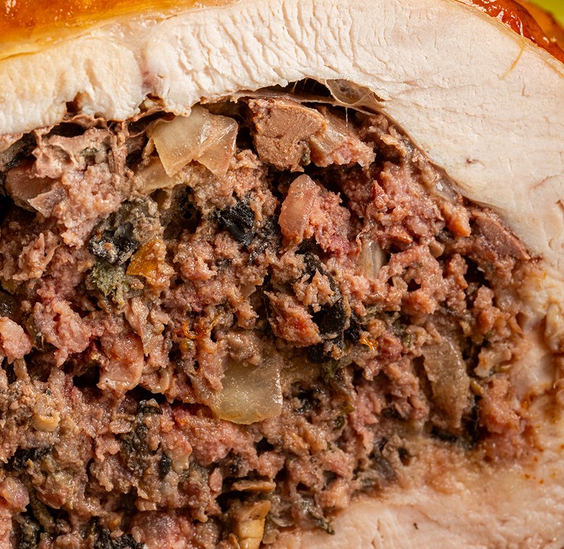 Pavo asado de Navidad con su relleno tradicional y guarnición de puré de patatas trufado. Acompañado de salsa en su propio jugo.