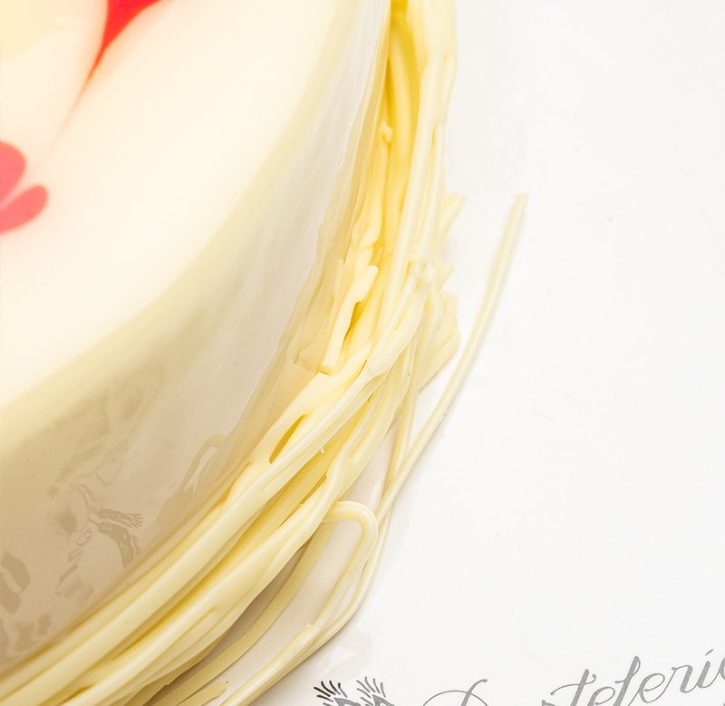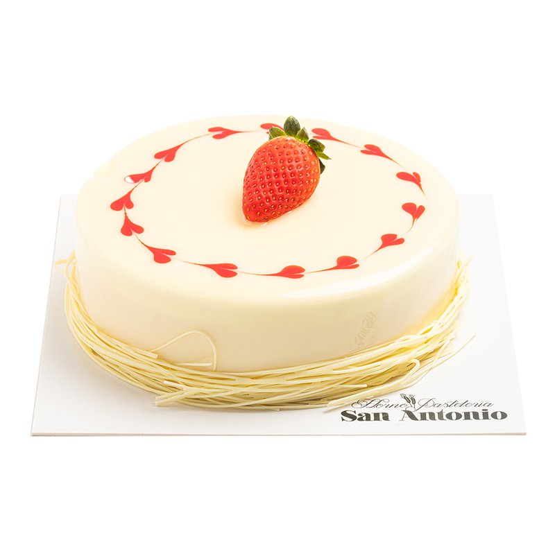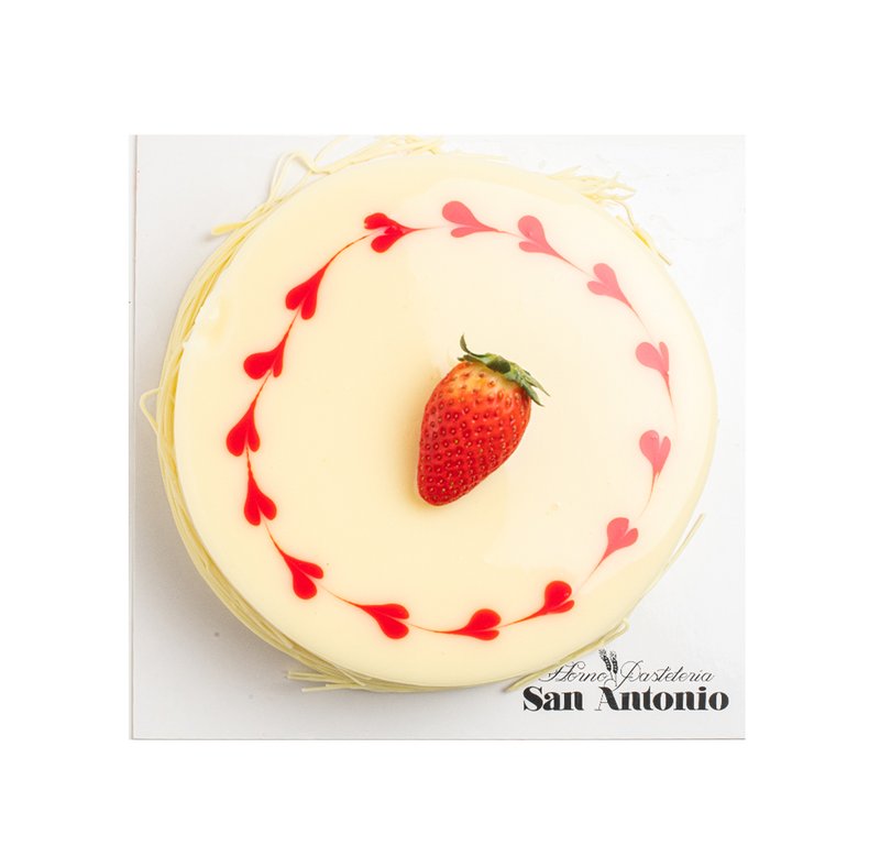 Tarta de mouse de queso y fresa natural con decoración de corazones.