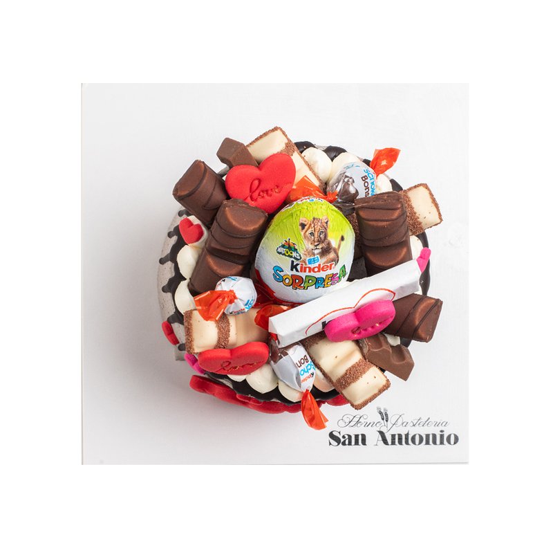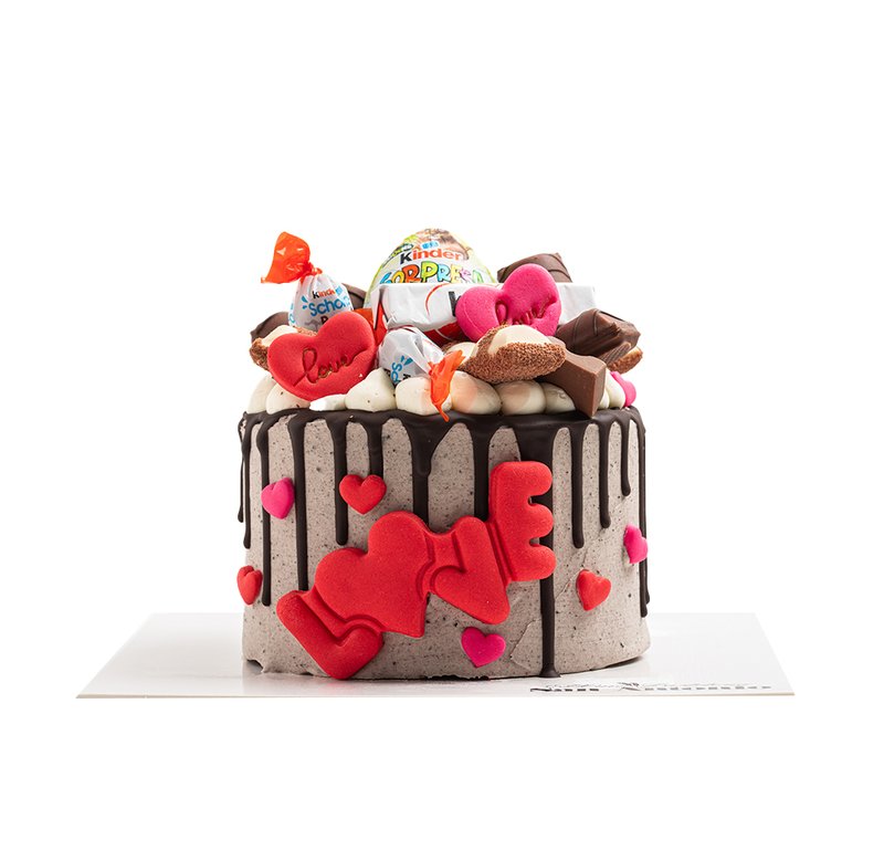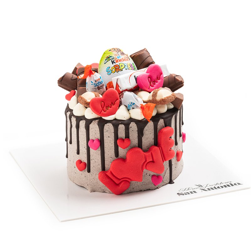 Tarta estilo americana de Oreo decorada con productos de Kinder en la parte superior y decorada con motivos de San Valentín comestibles.